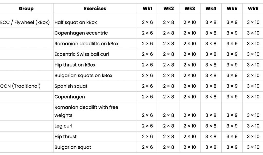 The athletes were divided into two groups: one undergoing traditional strength training (control group) and the other focusing on eccentric-oriented training using Exxentric’s kBox flywheel devices (experimental group). Both groups followed a six-week program with matched volume and session numbers.